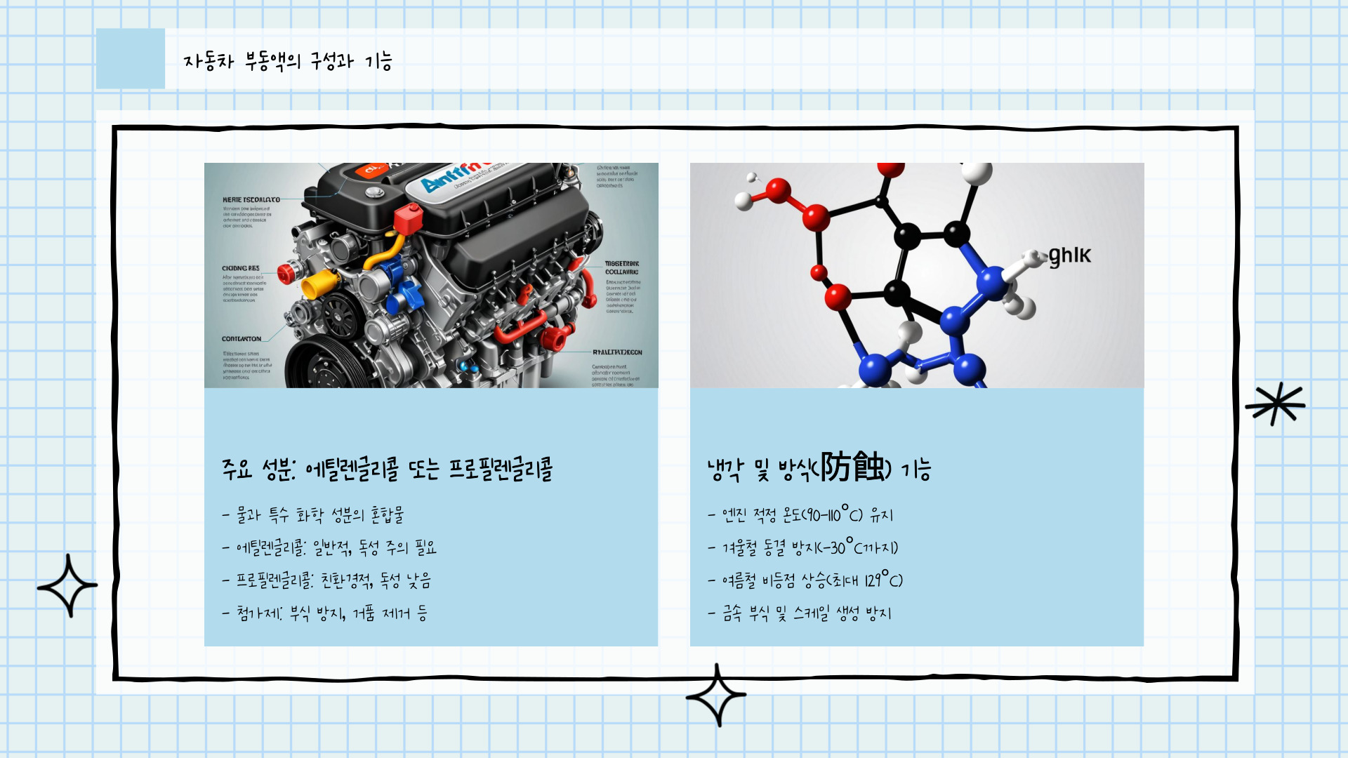 - 기능: 엔진 온도 유지, 부식 방지, 겨울철 동결 방지