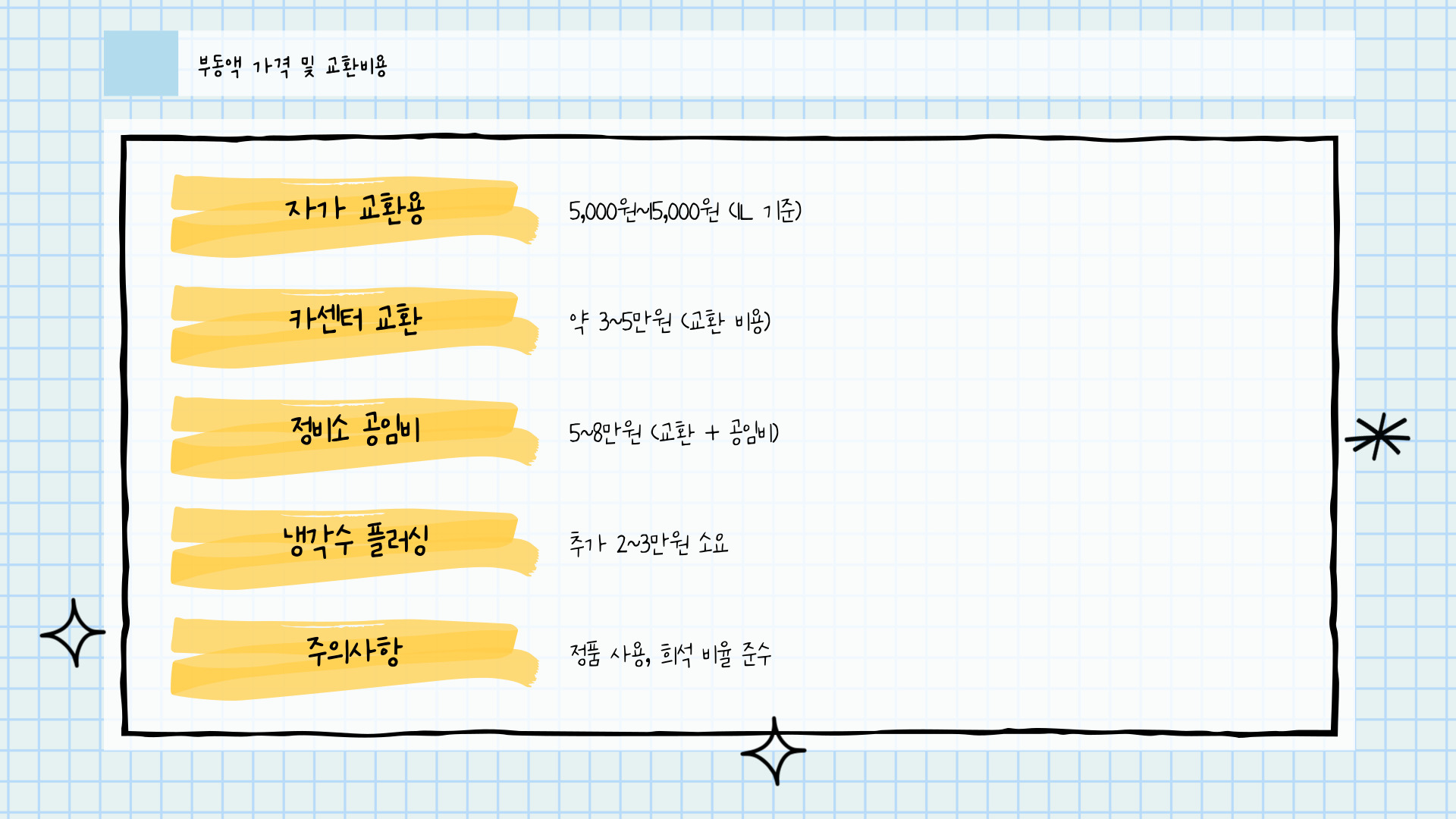- 자가 교환용 부동액 가격: 5,000원~15,000원 (1L 기준)